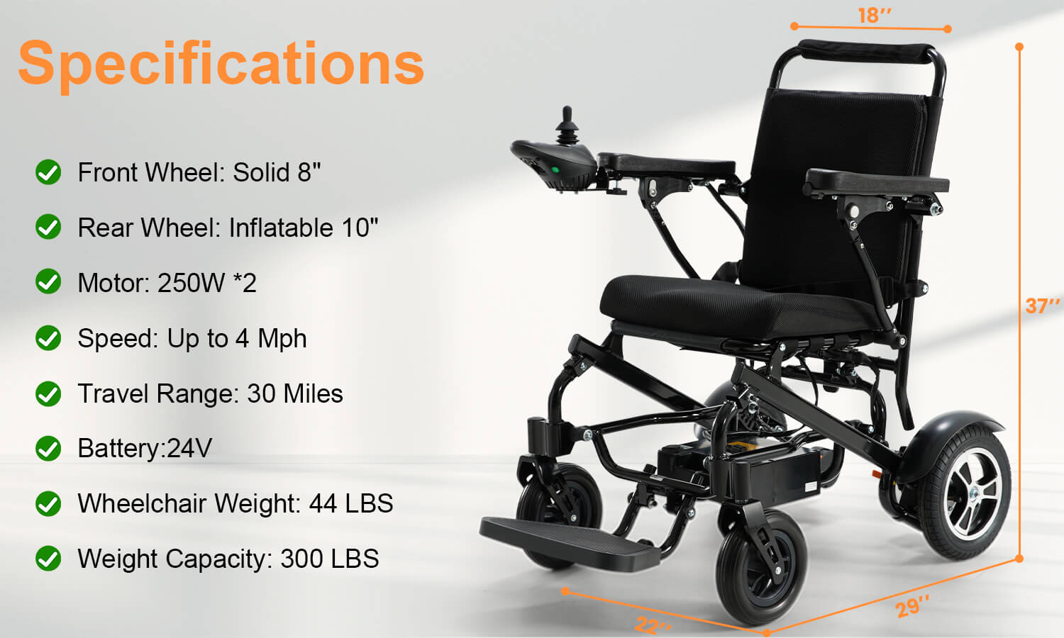 ASJMREYE lightweight electric wheelchair size, overall dimensions: 22" x 29" x 37". Folded size: 11“ x 22" x 35”. Weight Capacity: 300 lbs.