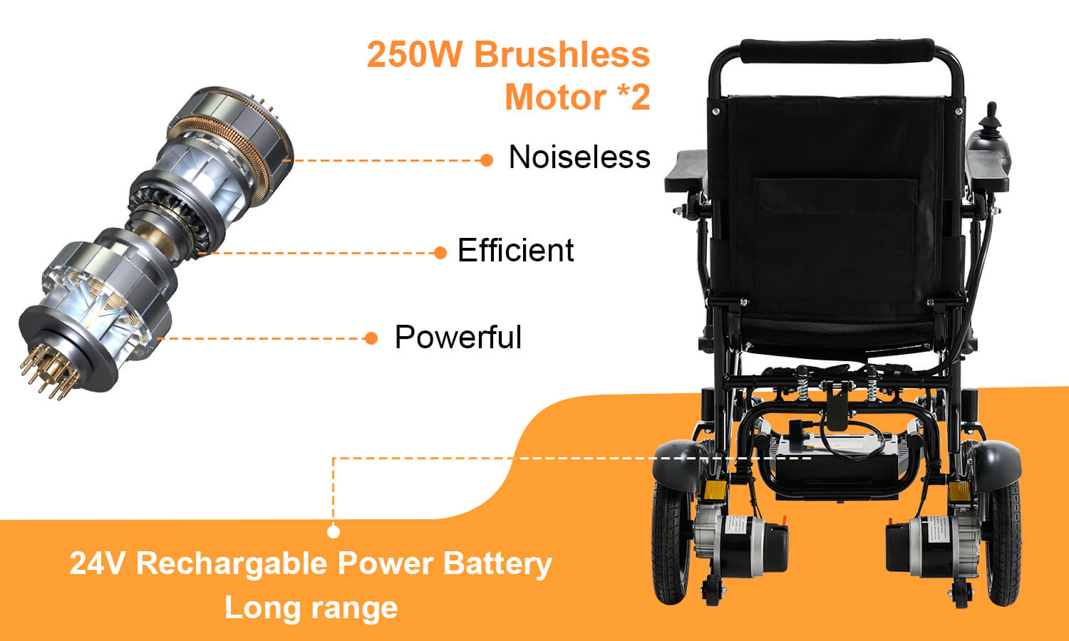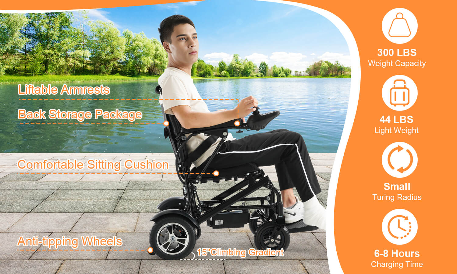 • [Super Lightweight and Foldable] This newly upgraded wheelchair only weighs 44 pounds! For seniors who have limited strength to move it in or out of trunk, this could be the perfect choice! The power wheelchair can be folded or unfolded in 3 seconds by an elderly! Both armrests and the pedal can be adjusted for easy get in and out of the wheelchair. Experience the convenience of mobility like never before with our foldable and lightweight power wheelchair!