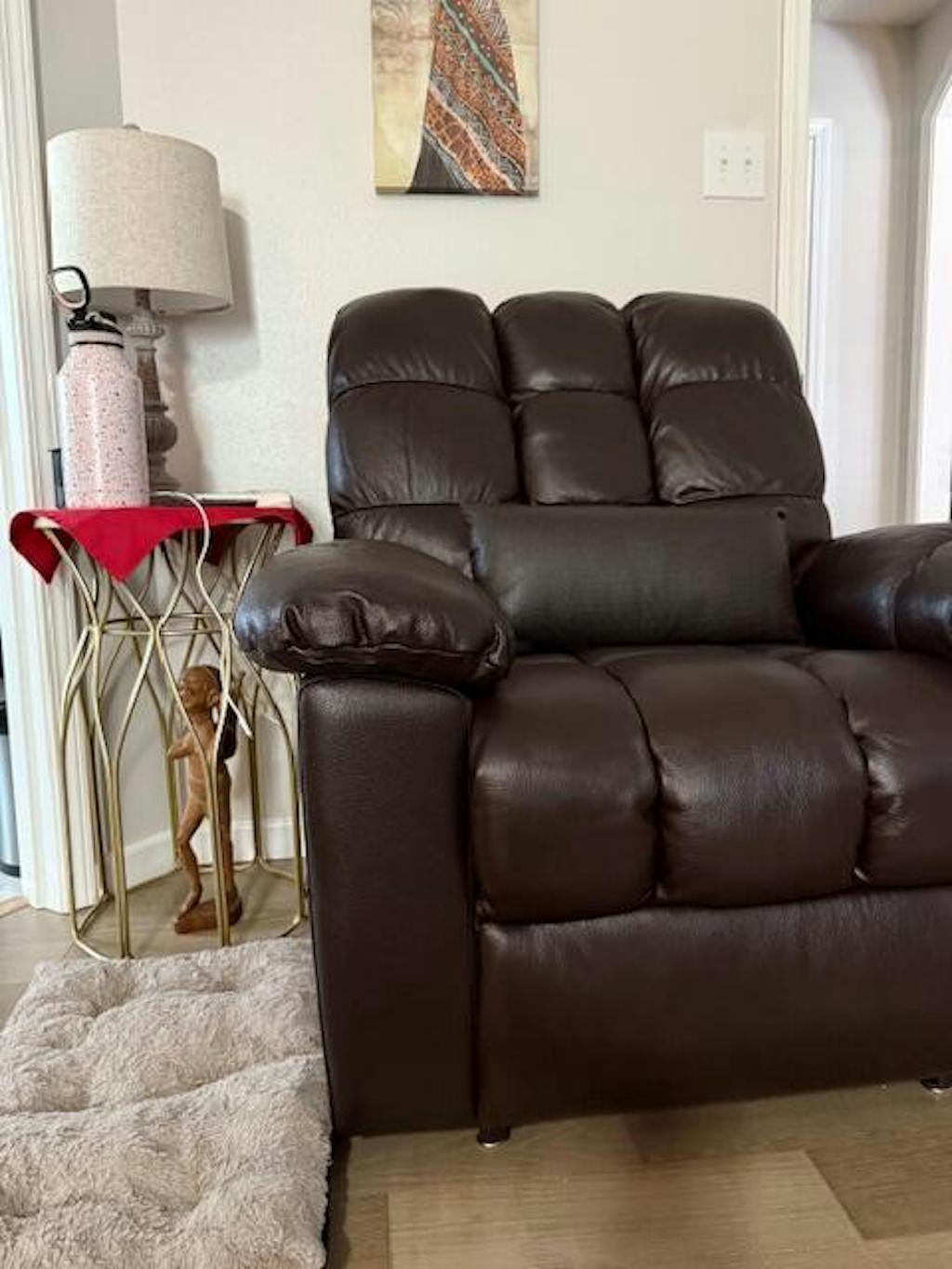 Brown leather recliner size data. Overall dimensions: 36.4“ x 28.7” x 41.3”, Weight capacity: 350lbs.